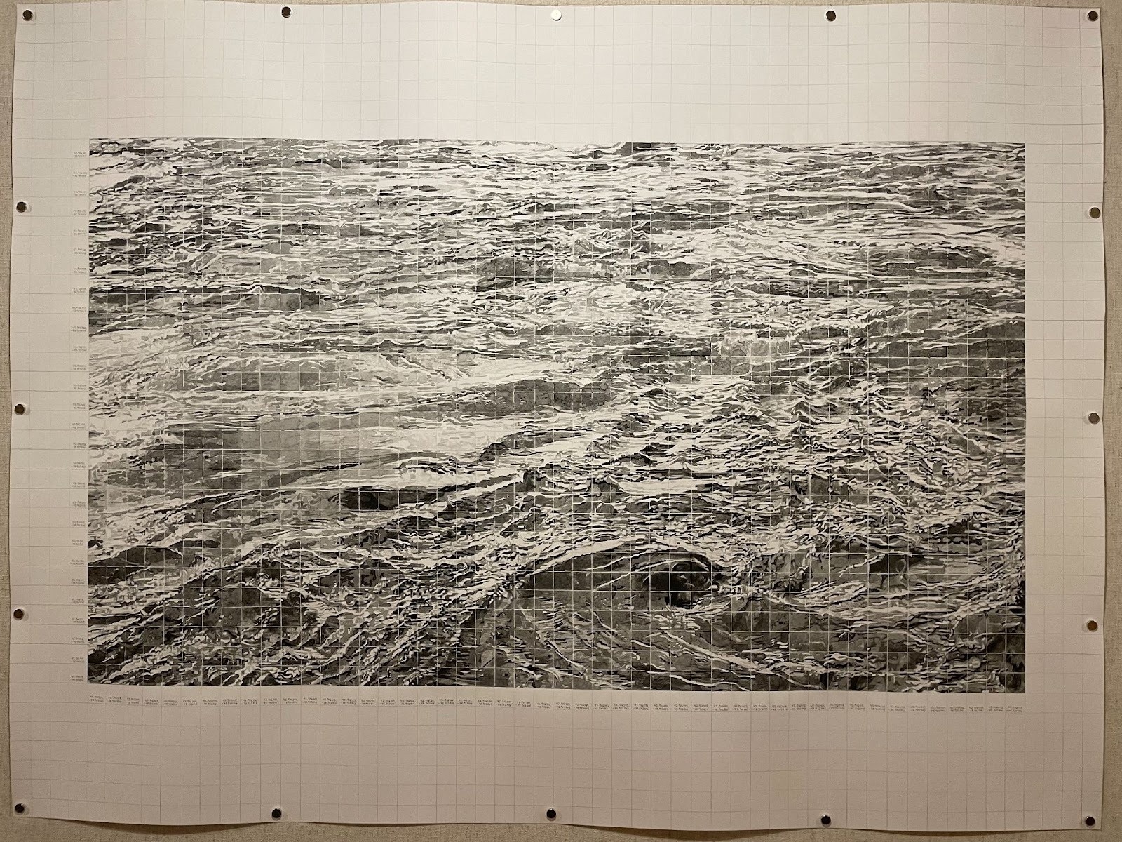 All of the drawings are linked by the use of grids. Chen harnesses the grid as a structural and theoretical device for creating complex, contemplative images, tapping into it as a powerful generative mechanism where each part and the whole are interconnected The grid is used to both retain and release control, embracing unpredictability and “errors” to express the uncertainty of being human. The rigid grid structure, paired with the unstable imagery, invites chance and intuition. This mix of qualities recalls the unruly nature of turbulence itself. Despite being studied exhaustively through fluid dynamics, the particular machinations of turbulence remain mysterious. While some instances are tangible enough as to their origin, others arise curiously and without a clear cause. The grids in Chen’s drawings grant a piecemeal order to the turbulence—fractured and unruly like the rapids and vortices that swirl within.