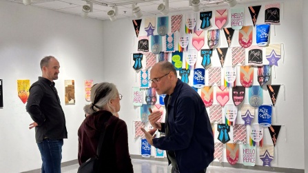 The show features a 15-person exchange portfolio entitled, “Banner Flags of Resistance and Revolution” which was originally conceived during the runup to the 2020 presidential election and whose themes remain highly relevant four years later. Also included are new woodcuts by David Barthold, a screenprint by University at Buffalo alumnus, Shirley Bassarath and a risograph by Tonja Torgenson and Christa Carleton from their collaborative, print series “Body Politic.” Finally, while the American zeitgeist is a cultural climate of hyper-polarized partisan conflict, Leslie Friedman offers an installation of printed, pennant-style flags which both celebrate our differences and focus on, inclusivity, self-care and friendship.
