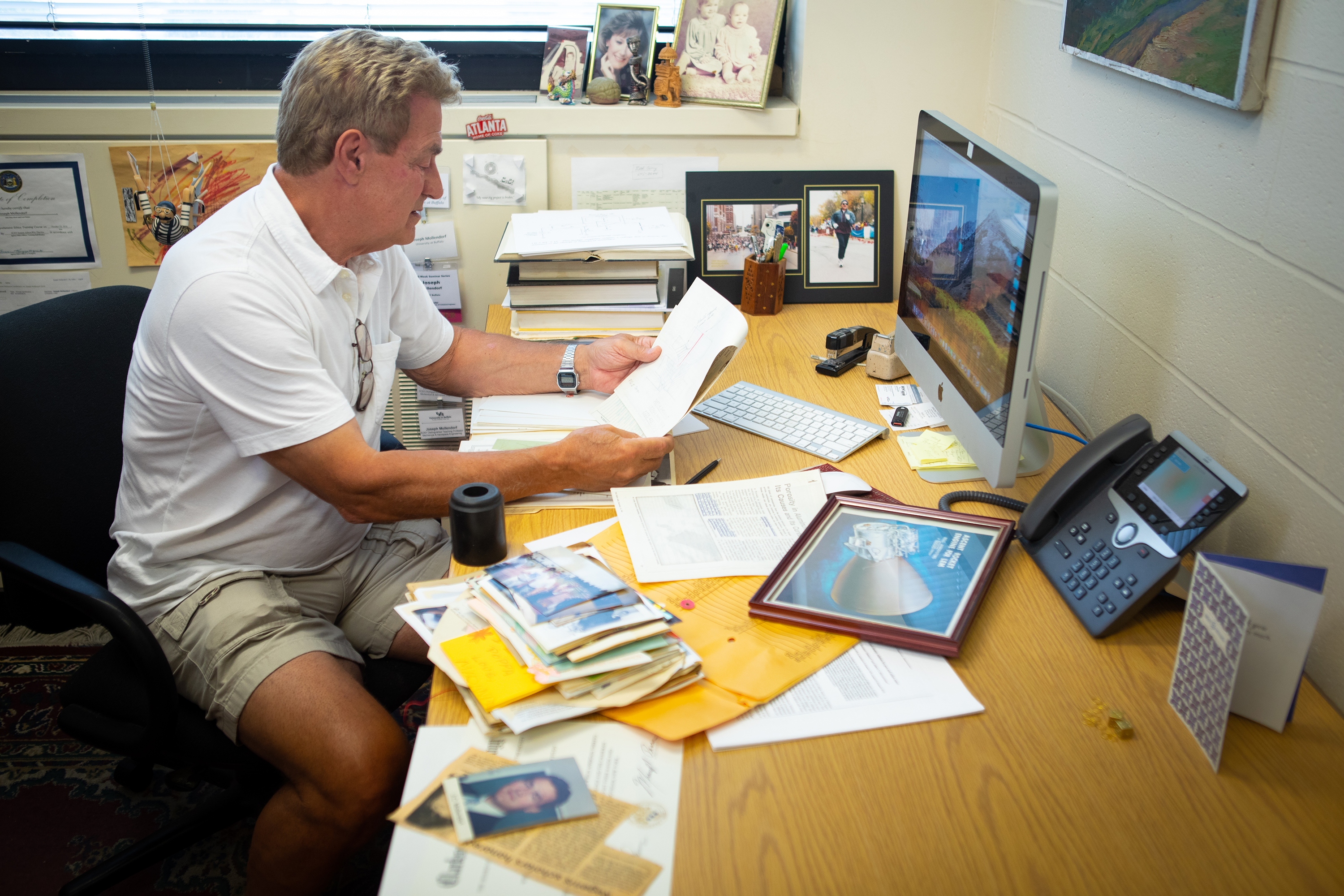 Mollendorf’s Jarvis Hall office is full of aerospace memorabilia. The items pictured here range from a signed photograph of Astronaut James Irwin on the moon to a newspaper clipping on a paper airplane contest he hosted for high school students. Credit: Douglas Levere / University at Buffalo