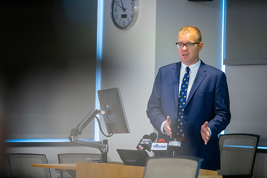 "They were in my corner before I was in my own corner," said Thomas Deponceau, a patient treated by Dr. Lynch in the Emergency Department and who was successfully linked to care through Buffalo MATTERS. He spoke with media at the UB briefing. (Credit: Douglas Levere, University at Buffalo)