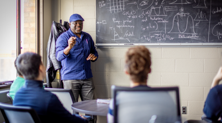 Herbert Fotso teaches in a graduate study meeting in Fronczak Hall in February 2024. Photographer: Douglas Levere