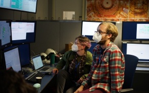 UB graduate student Lauren Hey (left) participated in the startup of Run 3 of the Large Hadron Collider (LHC) at the CMS detector in Summer 2022.