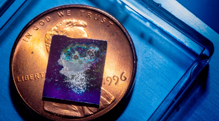 A silicon substrate with 2D heterostructures on top of a coin. Photo: Douglas Levere