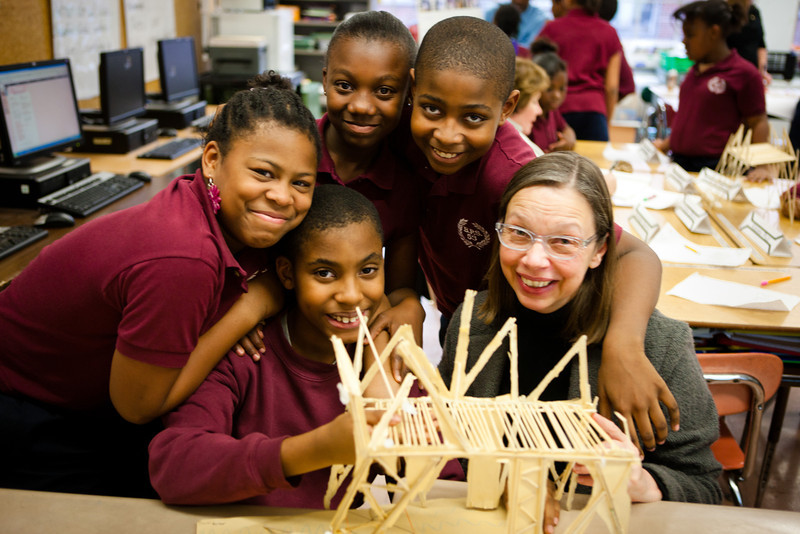 First-graders designed and tested methods of shading classroom windows using three-dimensional shapes in various configurations. Fourth graders built bridges out of sticks and tested them to see how many bricks they would support before they collapsed (seven in one case, one in another), then analyzed the results to understand why.