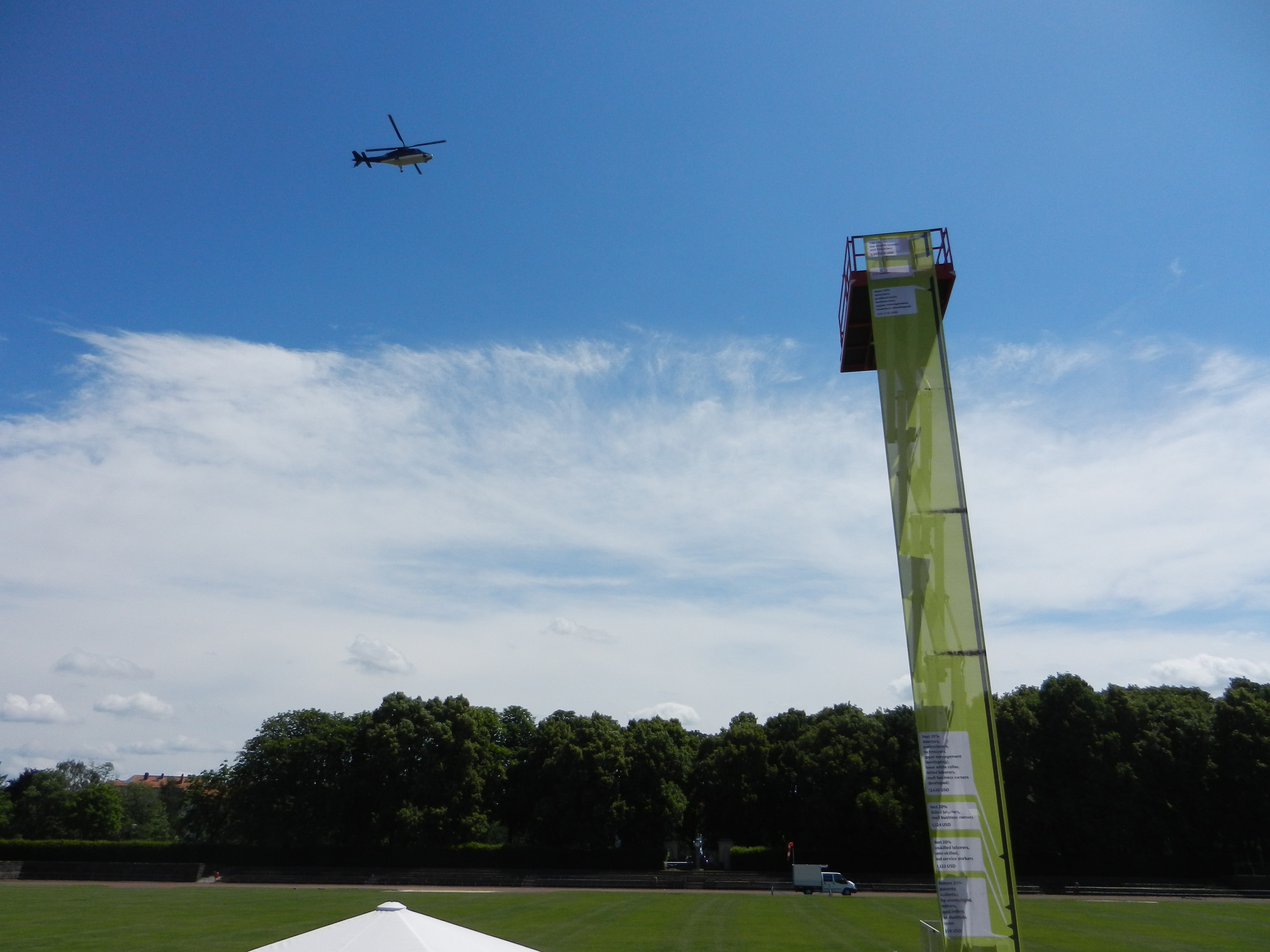"A Public Misery Message" consists of a vertical bar graph the height of a crane, which depicts global wealth disparity. It represents the economic wealth of the world population in quintiles (that is as fifths of the whole) with each .39 inch representing $100 in U.S. currency. The top one percent owns more than 15 times more wealth that of the rest of the world combined, an amount so great, that, if depicted graphically, would require the graph to be 738 feet tall. So the CAE employs a helicopter that rises 738 feet into the air, a point at which it represents, hyperbolically, the top one percent of us. A photo of "A Public Misery Message" is available here: (insert link).