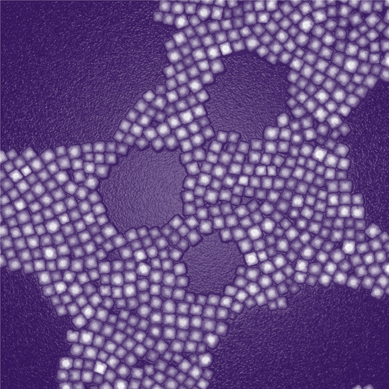 A transmission electron microscopy image of nanoparticles designed for deep-tissue imaging. Each particle consists of a core encased inside a square, calcium-fluoride shell. Photo credit: Zhipeng Li