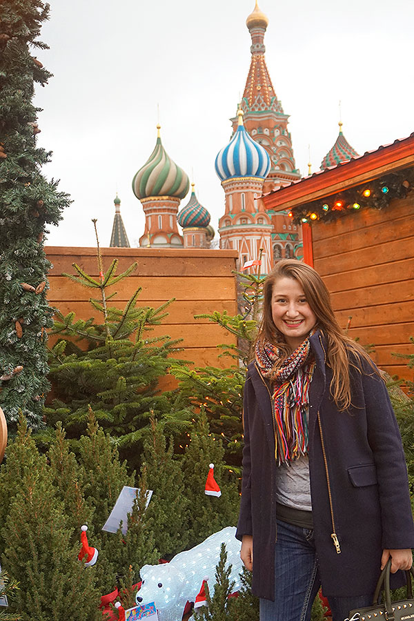 Courtney Burroughs browses in the New Years/Christmas markets in Red Square in front of St. Basil's Cathedral in Moscow.