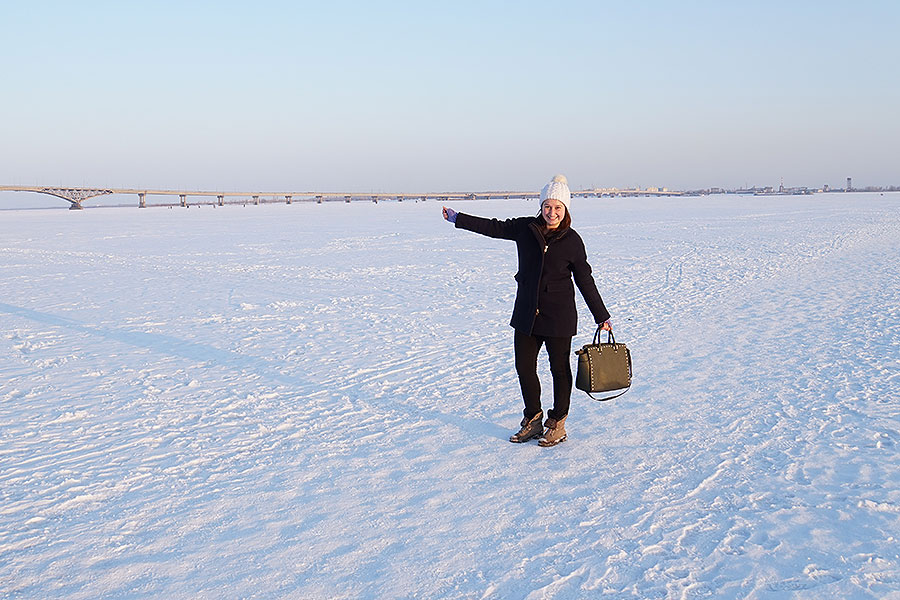 Courtney Burroughs stands on the frozen Volga River. The river is so wide in Saratov that it takes 50 minutes to walk across it when it is frozen.