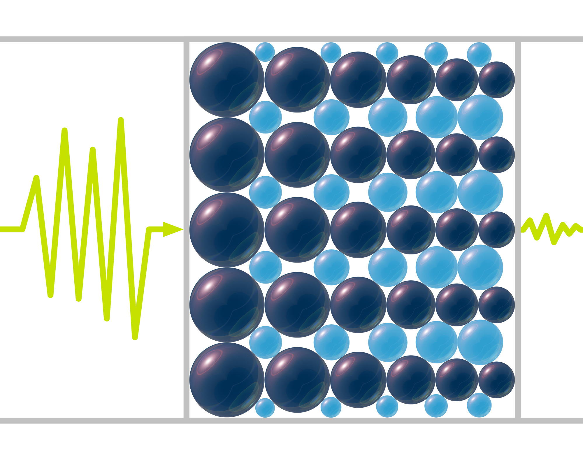 An artist's illustration of a system designed to help block high-frequency sounds of up to 20 kilohertz. The system comprises tapered chains of Delrin plastic beads (darker beads) alternating with tapered chains of tungsten carbide beads (lighter beads), surrounded by plastic walls. Credit: Robert Rivera, University at Buffalo; Luis Machado, Federal University of Pará in Brazil