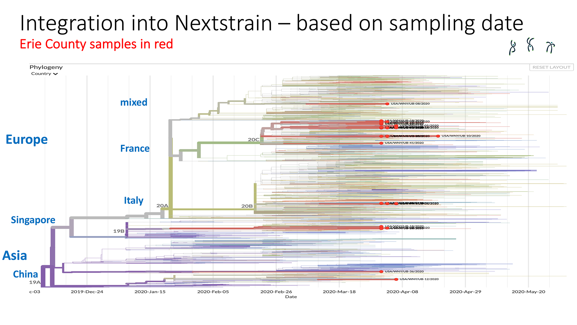 In the first batch of samples from patients who were sick with COVID-19 in early April, the majority, approximately two thirds, of virus samples from Western New Yorkers seemed to be of European origin, primarily Italy, France and Spain. The remaining third appears to have come through China and Singapore.