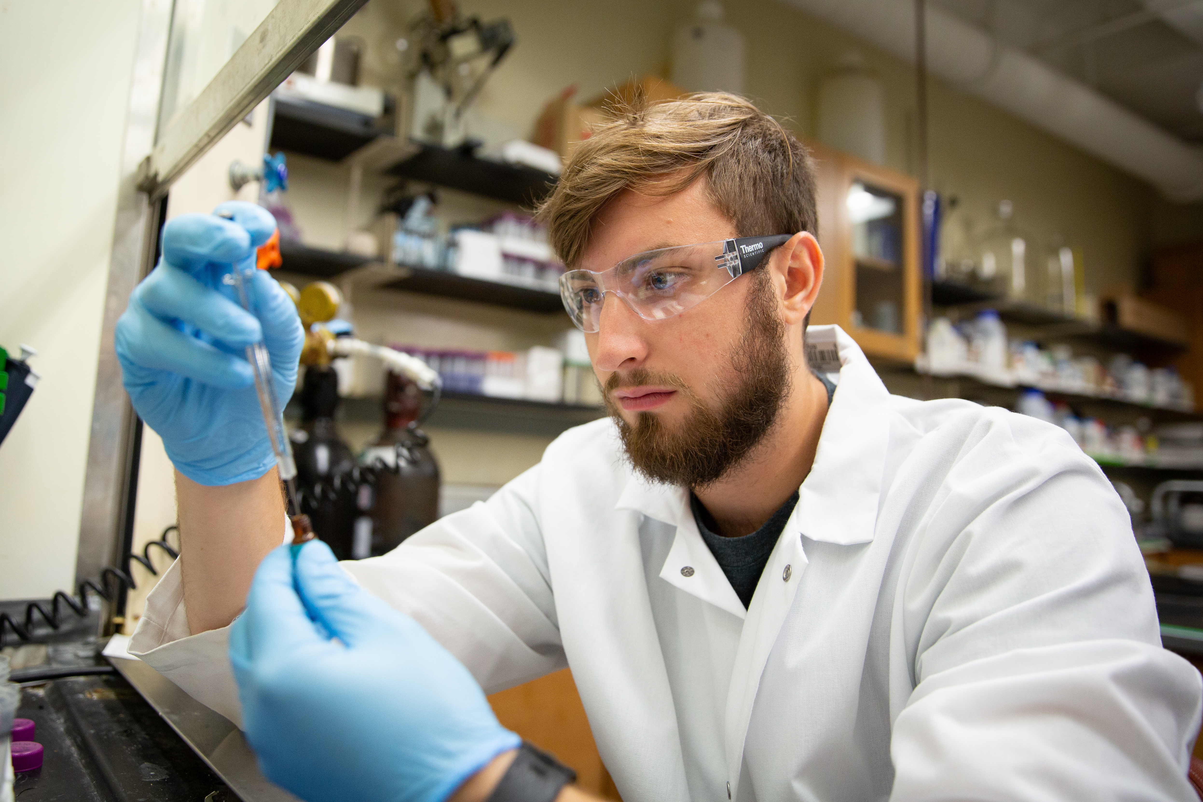 University at Buffalo chemistry PhD student Steven Travis measures the volume of a chemical standard, a solution that contains known amounts of a certain chemical, in 2018. Chemical standards act as a reference, enabling scientists to accurately quantify traces of chemicals found in analytical testing. Travis has since successfully defended his PhD thesis. Credit: Meredith Forrest Kulwicki / University at Buffalo