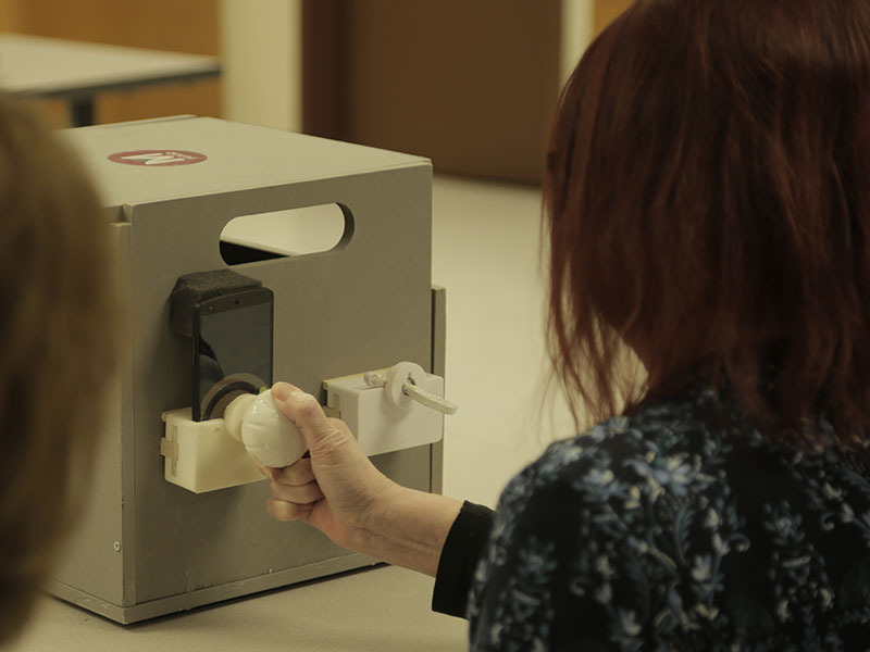An mRehab study participant turns the 3D-printed doorknob.