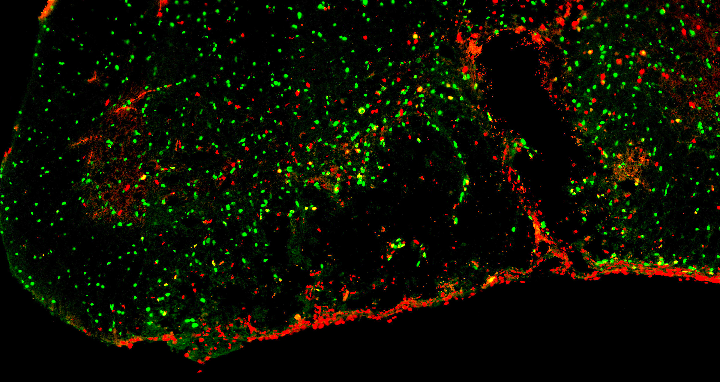The inflamed tissue environment following demyelination prevents recruitment of oligodendrocyte progenitor cells (OPC) (green) and halts their division (red). This can be overcome by treatment with PI-88, a modulator of the heparanome (Credit: Darpan Saraswat).