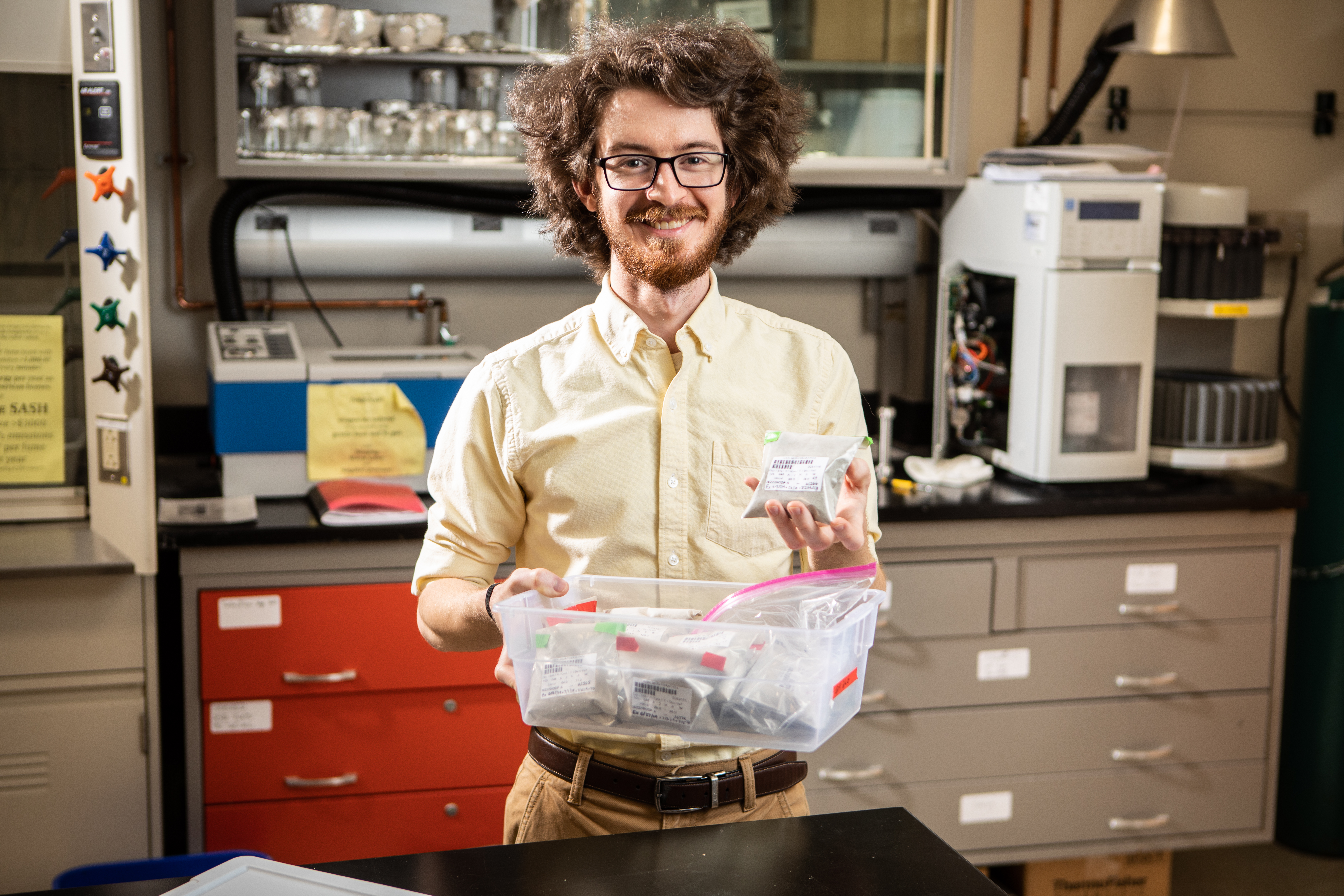 Owen Cowling, laboratory technician and University at Buffalo alumnus, holds a container filled with bags of ocean-bottom sediments. Cowling, a 2018 UB geology MS graduate, was among scientists who helped to process samples for a study on summer temperatures in southern Greenland during past interglacials. Credit: Douglas Levere / University at Buffalo. Download additional photos.