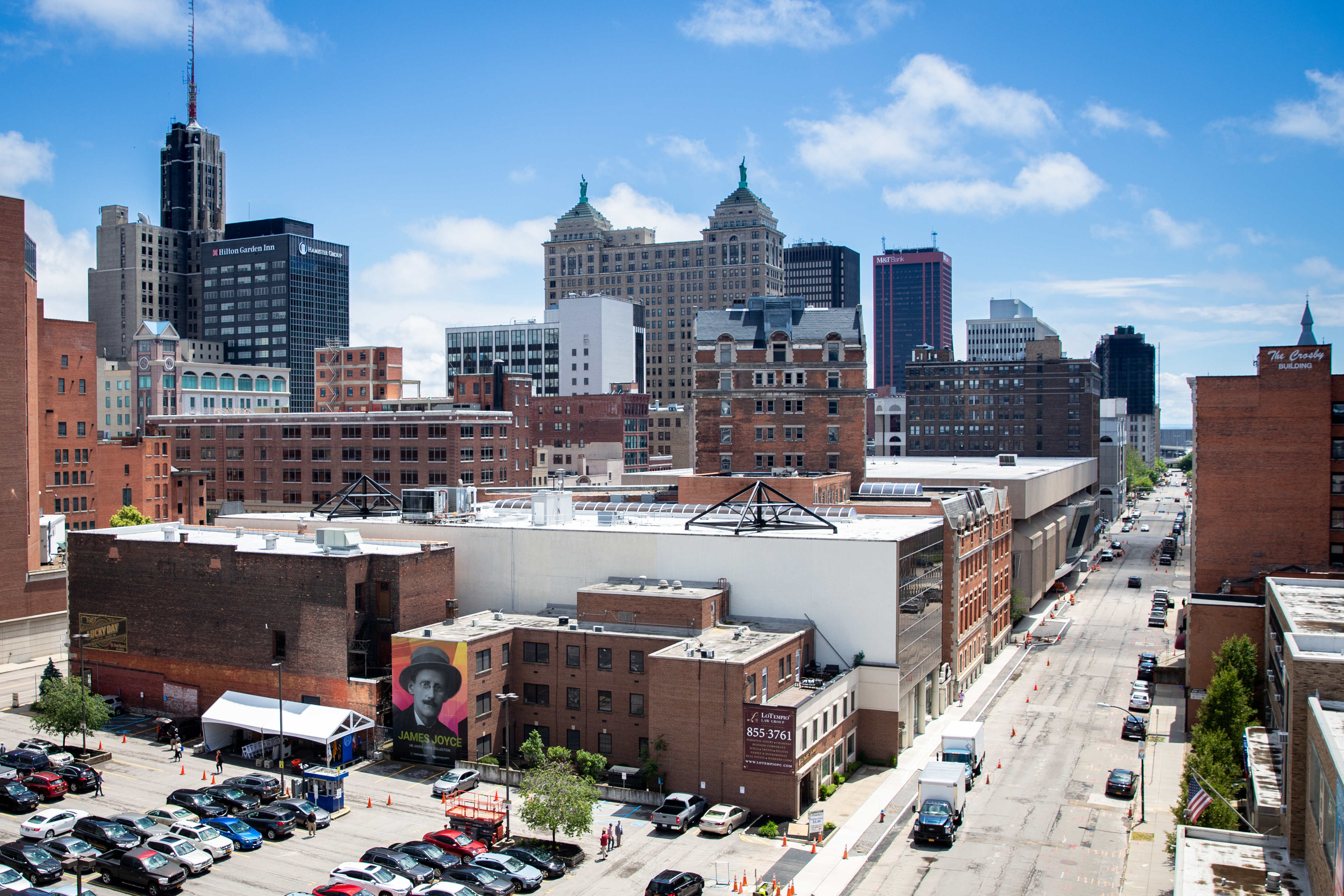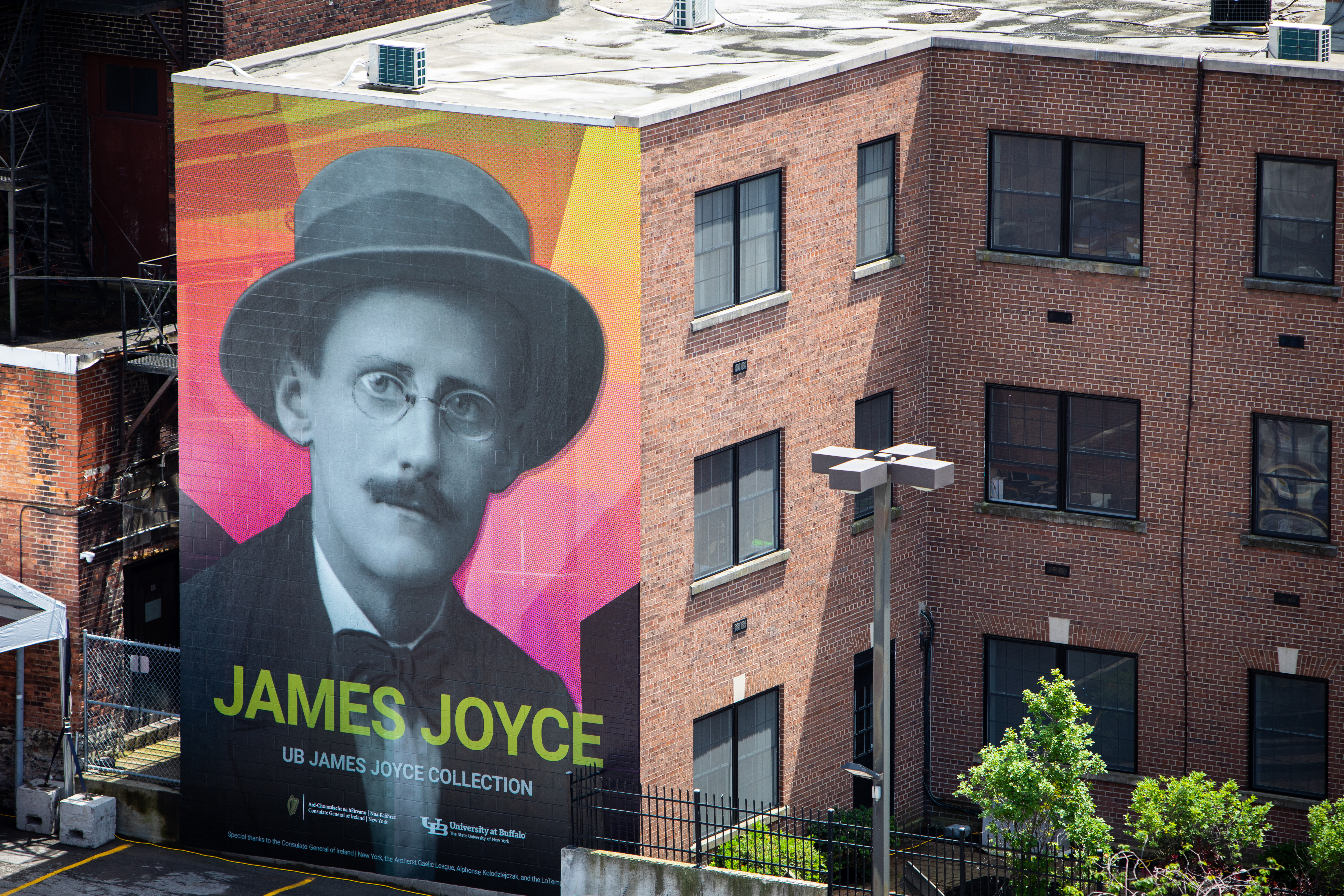 The mural, based on an archival photograph of Joyce from the UB James Joyce Collection, was designed by Kristopher Miller, UB Libraries web manager and lead designer, and installed by Rory Allen, owner of Buffalo-based ZoomCopy.com. UB alumnus Frank LoTempio III, JD, and the LoTempio family donated use of the LoTempio P.C. Law Group building.