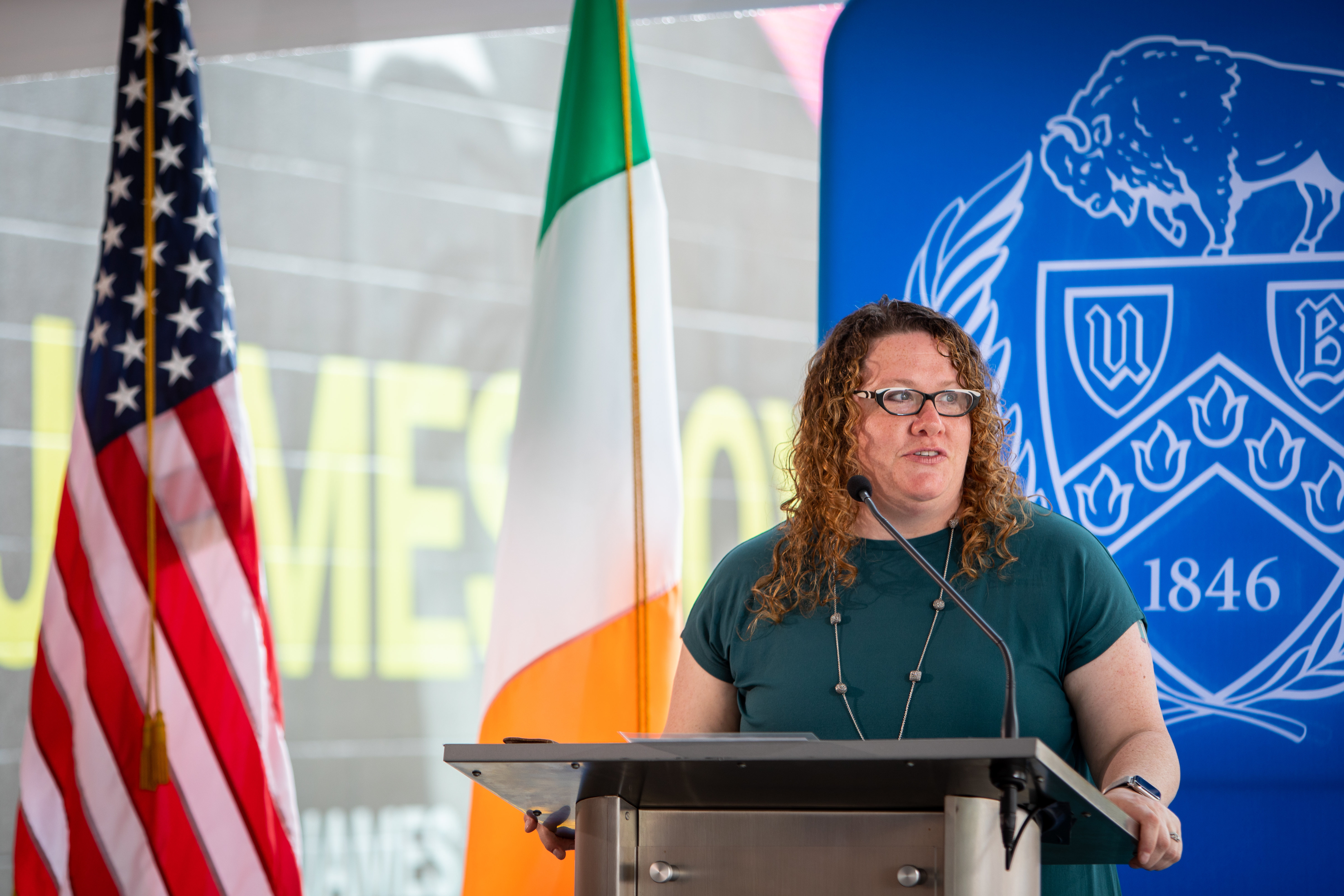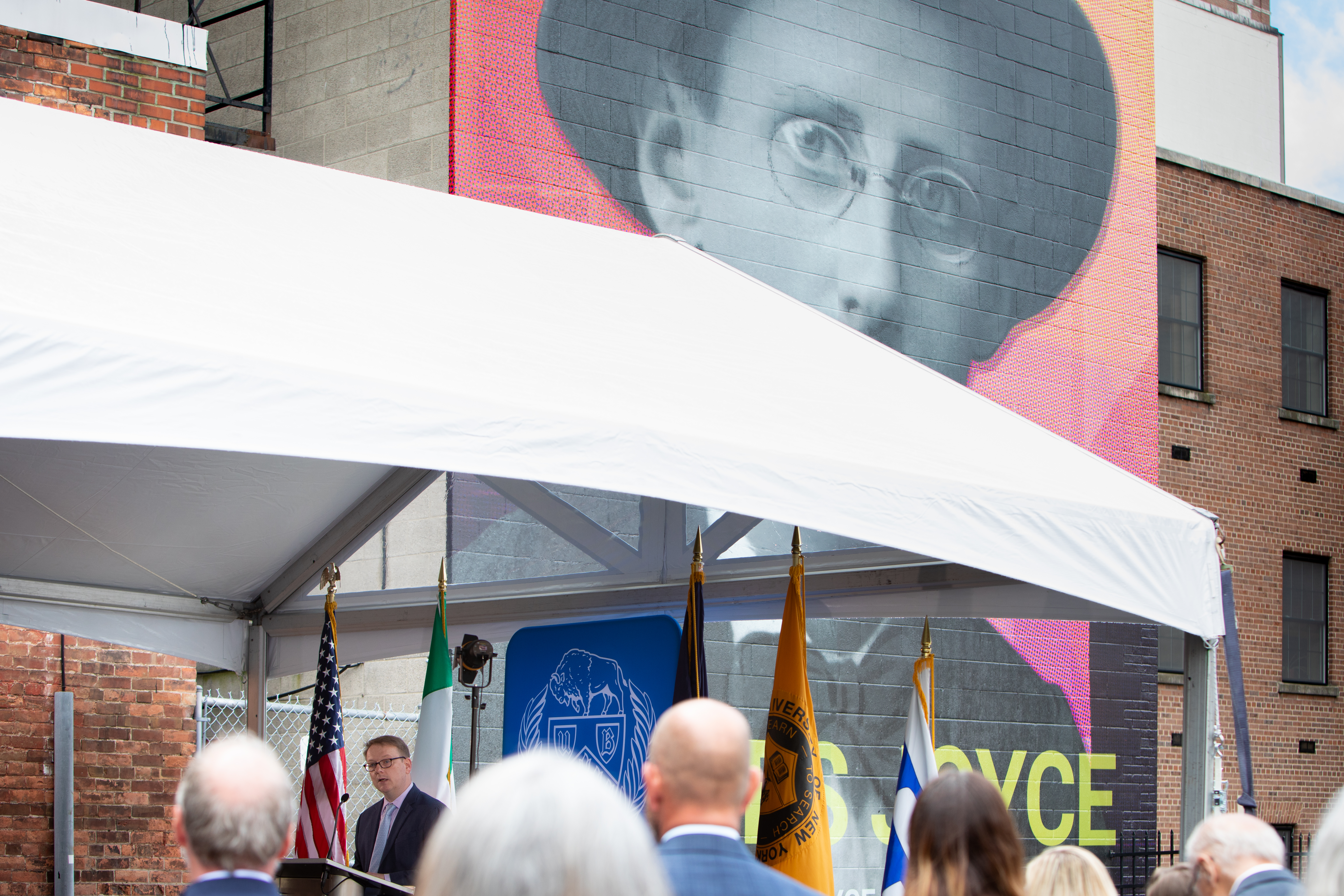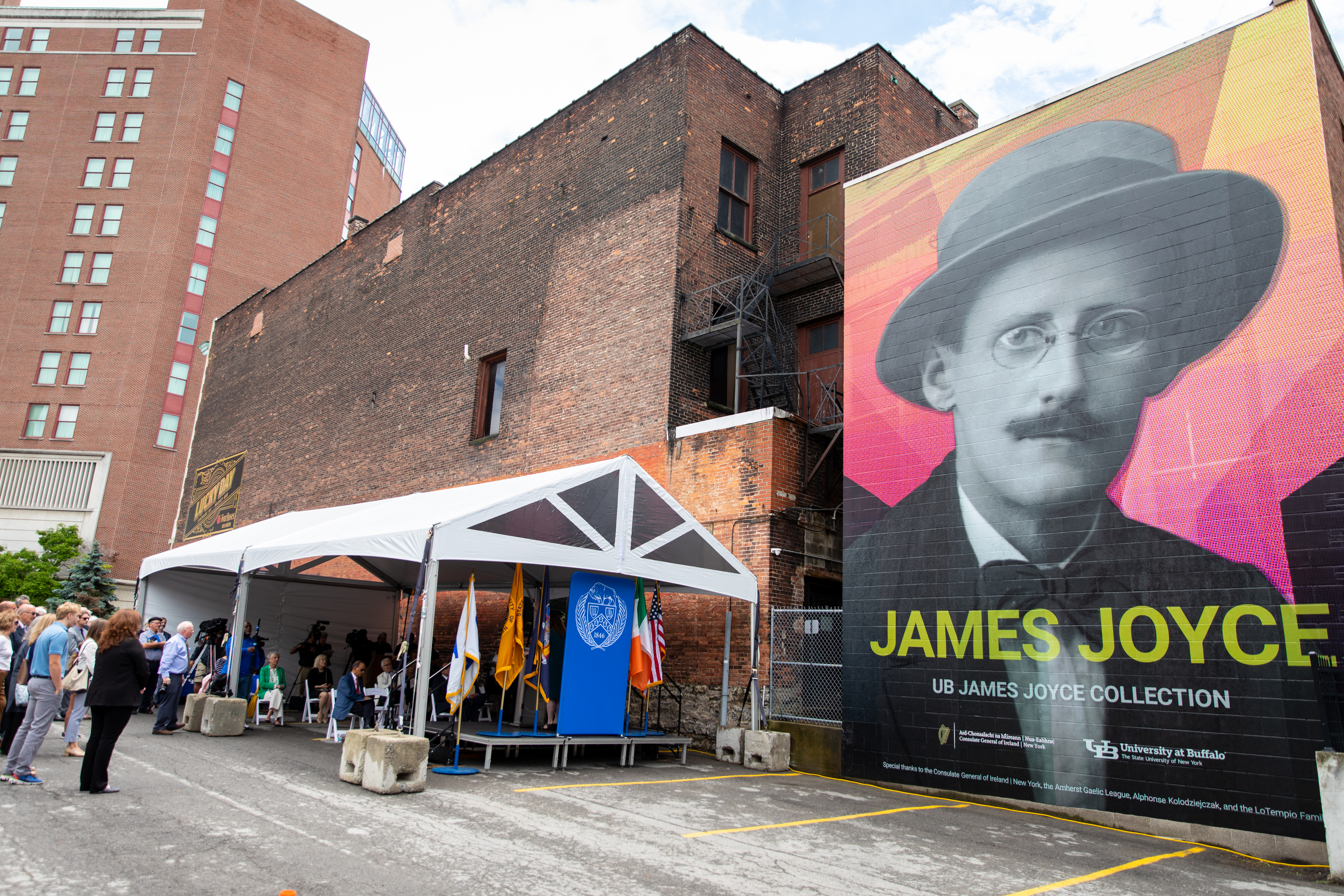 “We are delighted to partner with UB to erect and unveil this mural. The links between Ireland and Buffalo, and Western New York more generally, are deep and longstanding; we will always celebrate them,” says Madden. “However, the UB James Joyce Collection is something distinct and special. Through its world-class collection about an Irish writer, UB is connected to experts and fans of Irish culture all over the world. With next year’s centenary of the publication of James Joyce’s ‘Ulysses,’ we hope that many more people will read Joyce for the first time, and through Joyce, discover this wonderful collection in the heart of Western New York.”