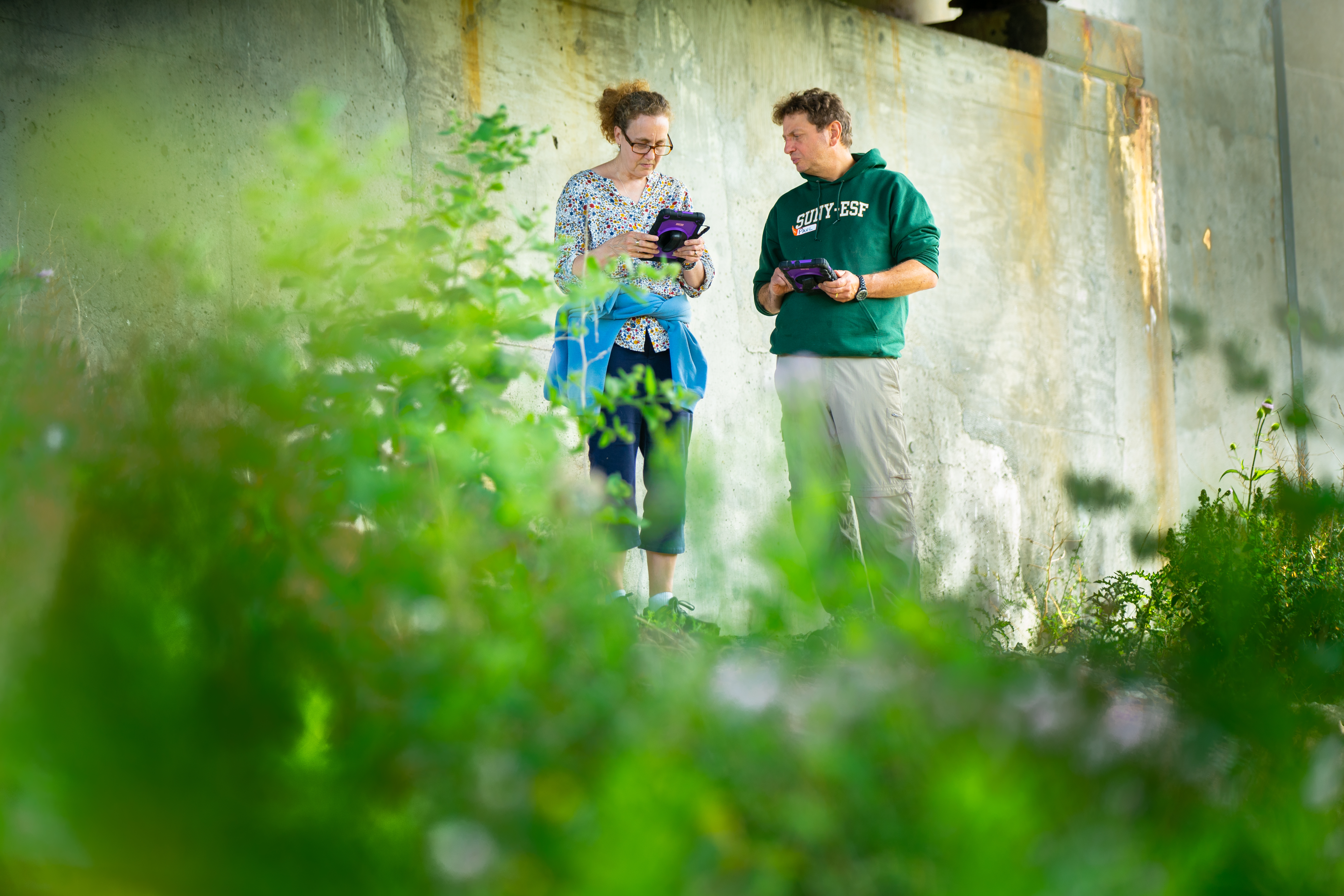 From left: Sara Rockwood-Klute, biology and earth sciences teacher at Eden High School, and Paul Parrinello, chemistry and earth sciences teacher at Depew High School, examine information on a tablet. Credit: Douglas Levere / University at Buffalo