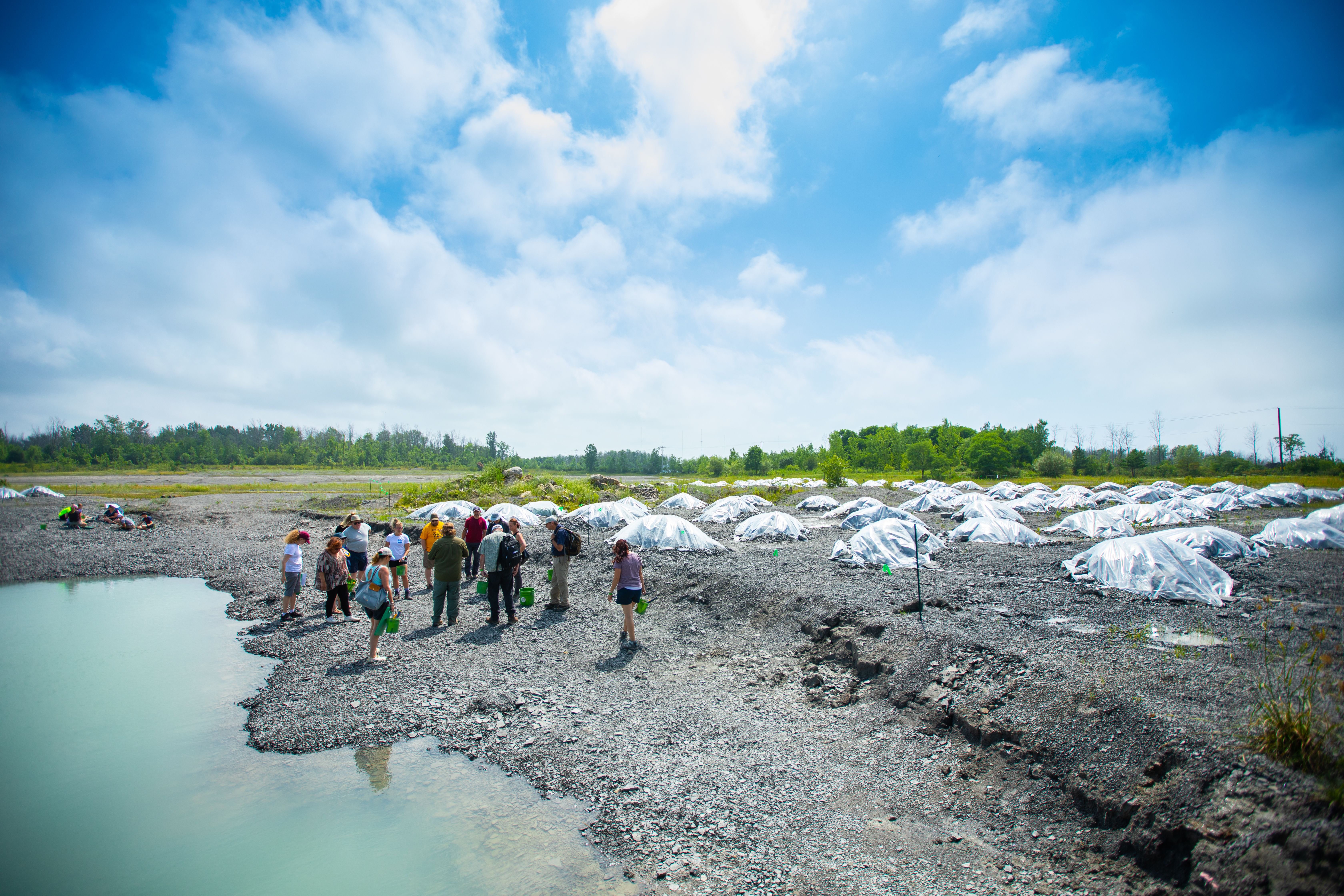 Teachers in the EarthEd Institute visited Penn Dixie Fossil Park and Nature Reserve on July 14 to learn about fossils and rocks that can be found in Western New York. Plastic sheeting protects piles of fresh rock for future programs in the background. Credit: Douglas Levere / University at Buffalo