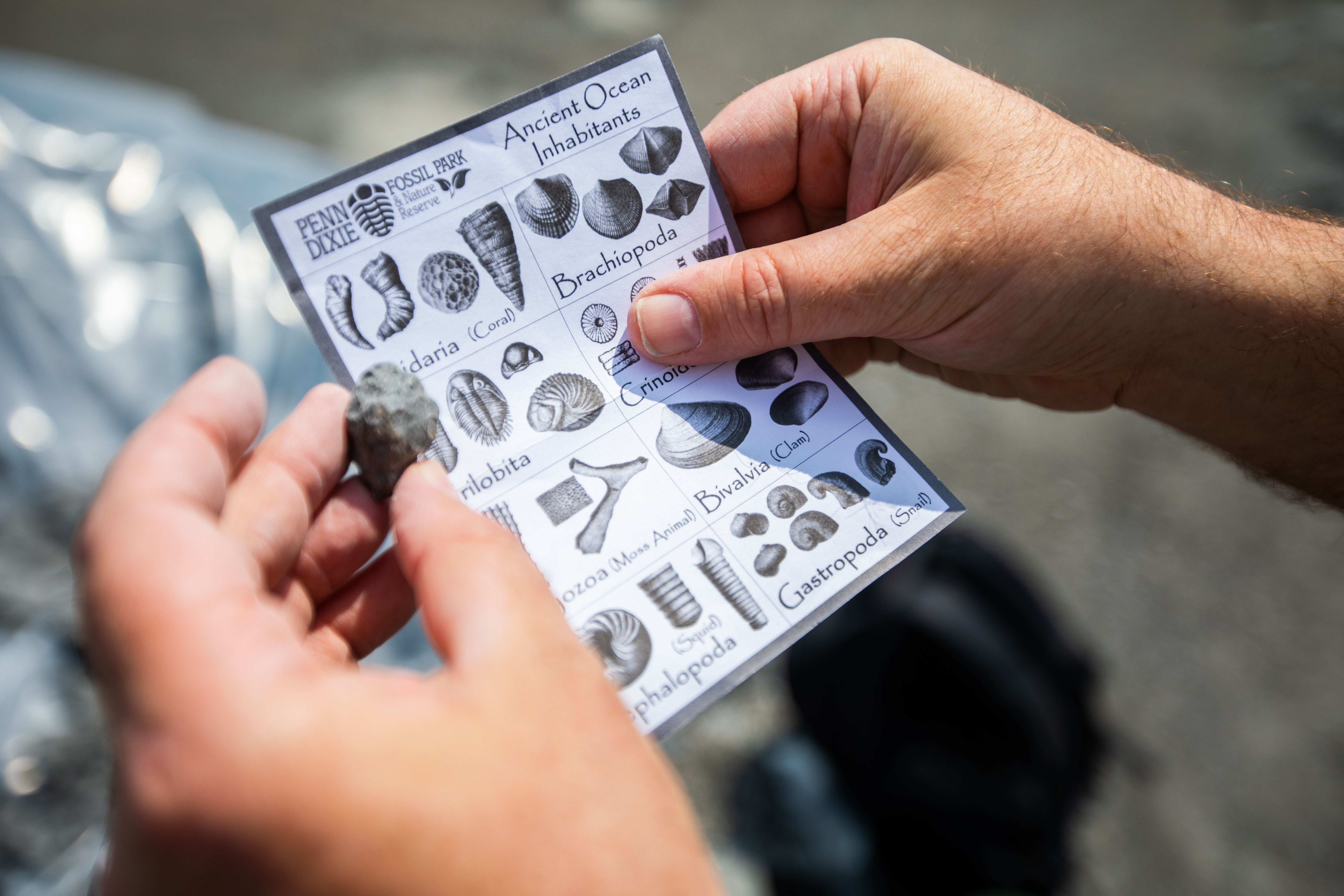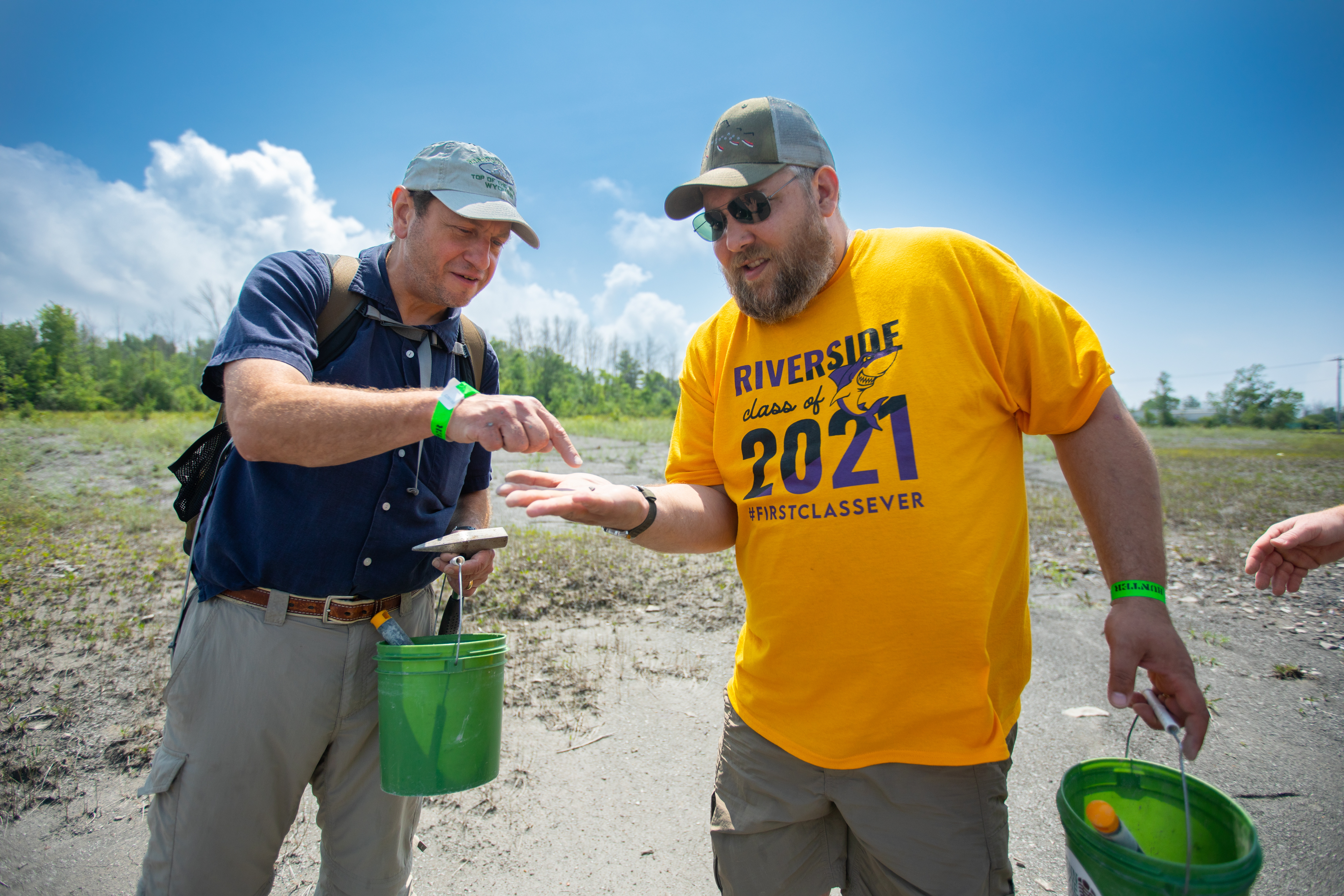 Paul Parrinello (left), Depew High School teacher, and Jerome Krajna, Riverside Academy teacher, investigate a specimen at Penn Dixie Fossil Park and Nature Reserve. Credit: Douglas Levere / University at Buffalo