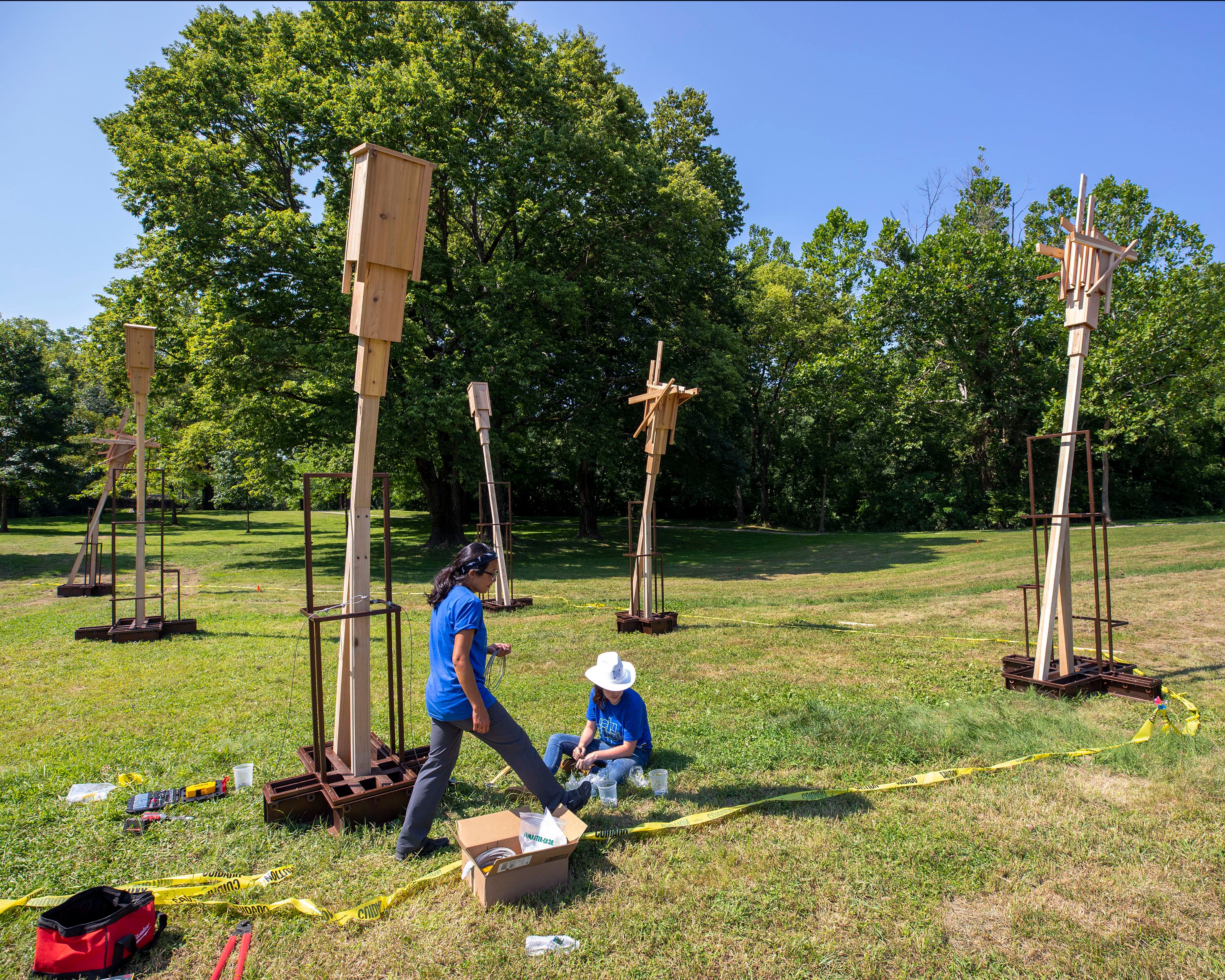 Sited within the landscape of Columbus’ Mill Race Park, Hwang’s installation is conceived of as a series of “strata,” featuring bat and bird habitat conditions above, and environments for terrestrial and amphibious species below.