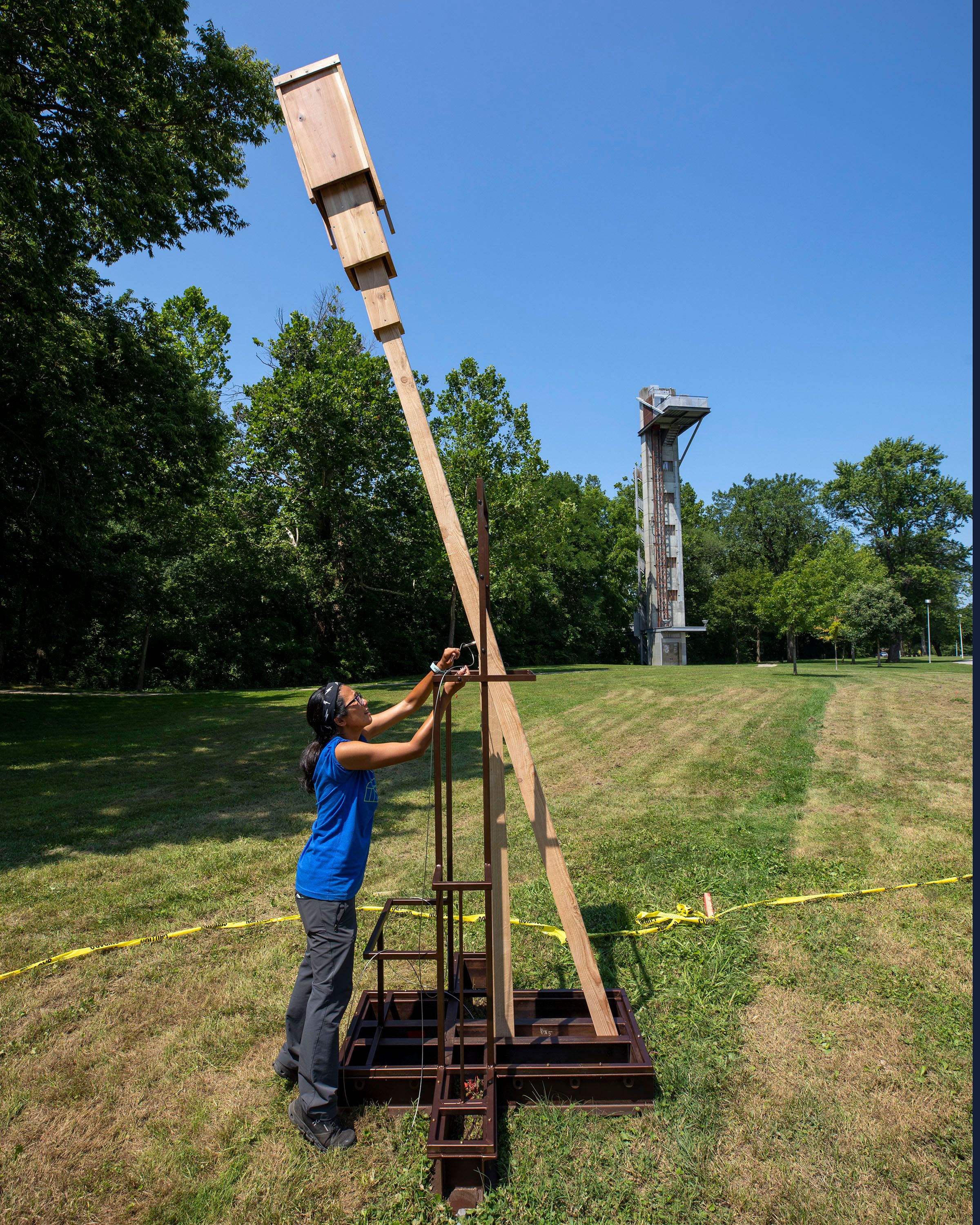 Ultrasonic detectors placed at the top of the 84-foot-tall observation tower in Mill Race Park will regularly record bat calls. The recordings will be accessible to visitors, both in-person and through online platforms. Photo: Hadley Fruits