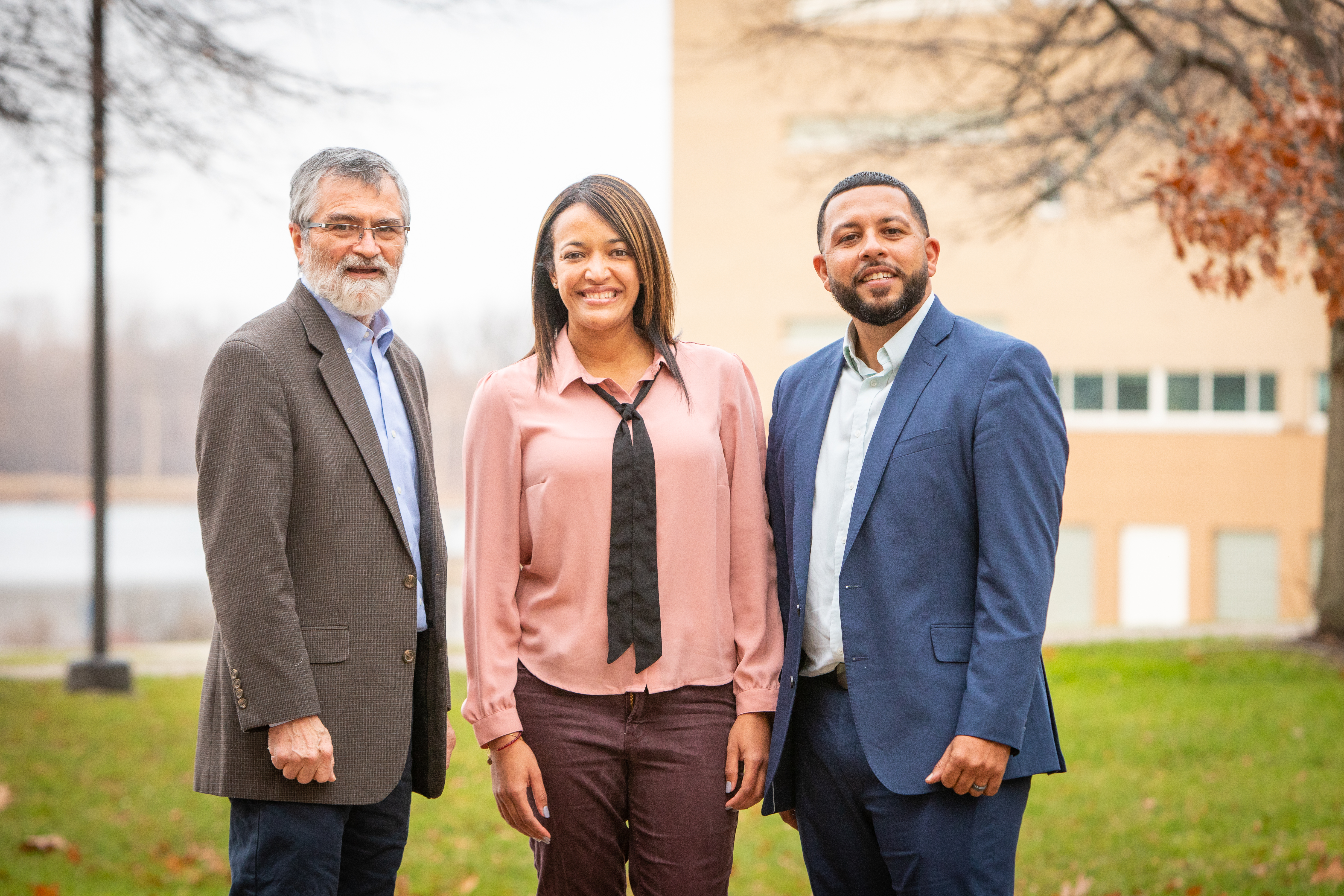 Left to right: Luis A. Colón, A. Conger Goodyear Professor of Chemistry at UB; Ivonne M. Ferrer, UB PhD graduate; and Jesús M. Velázquez, UB PhD graduate. Ferrer and Velázquez visited UB in December 2021. Colón helped recruit both to the university years ago. Ferrer is now a quality analytical leader at Corteva Agriscience, and Velázquez is now an assistant professor at the University of California, Davis. Credit: Meredith Forrest Kulwicki / University at Buffalo