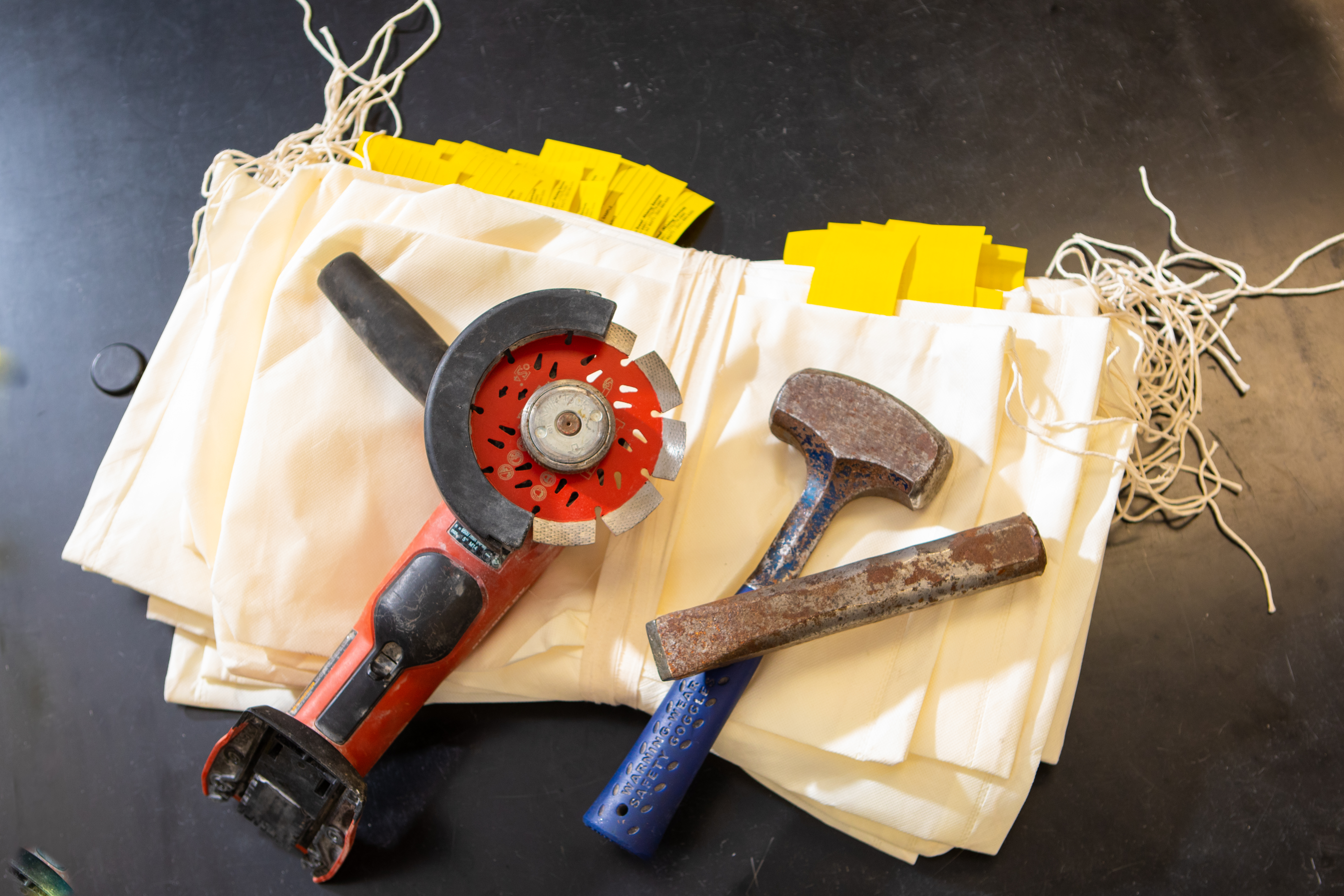 Rock sampling tools. A rock saw, chisel and hammer, used for collecting rock samples, sit atop bags for storing and cataloging the samples. Credit: Douglas Levere / University at Buffalo